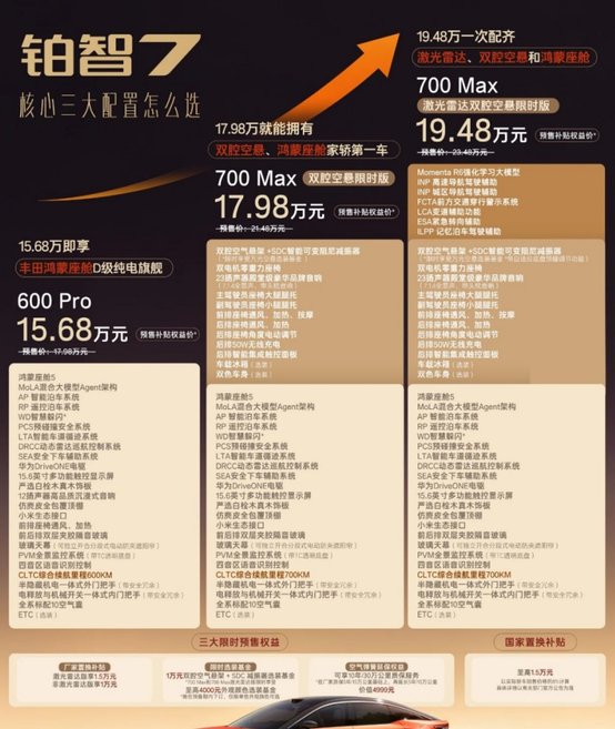 在此基础上,铂智7全系还可享最高1.5万元国家置换补贴。最终,铂智7预售权益价低至15.68万元起: