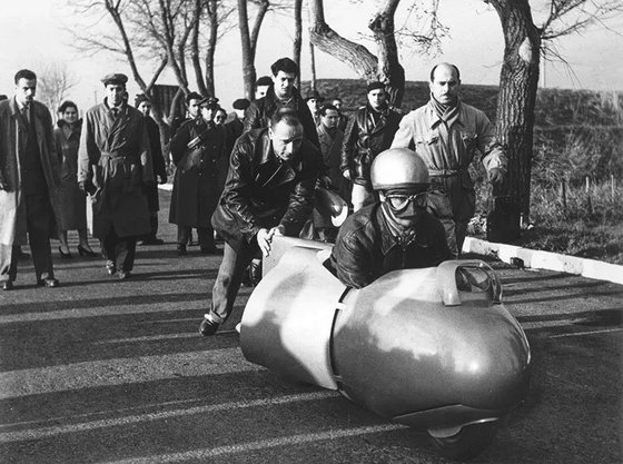 1950年2月9日,Vespa决定挑战难度最高的竞速项目:1公里冲刺计时赛。在Rome-Ostia公路上第10和第11公里处,原厂试车手Mazzoncini骑着一辆Corradino所设计、装置两具水平对向活塞发动机的Vespa,以21.4秒完成1公里冲刺加速,来回两趟最高车速的平均值为171.1公里/小时,两项数据都刷新了全部的赛事速度纪录。