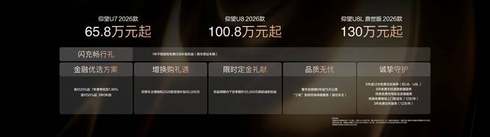 3月5日,比亚迪第二代刀片电池暨闪充技术发布会在深圳成功举办,2026款仰望U7、U8、U8L同步重磅上市。仰望U7 2026款售价65.8万元起;仰望U8 2026款售价100.8万元起;仰望U8L鼎世版 2026款售价130万元起。作为比亚迪对技术初心最极致的回应,仰望自诞生以来始终坚持以极致技术构建高端品牌,为用户带来颠覆性的产品和体验。仰望2026款旗舰矩阵升级搭载比亚迪第二代刀片电池及闪充技术,让用户告别补能等待,为时代同行者带来前所未有的时间掌控与极致体验。