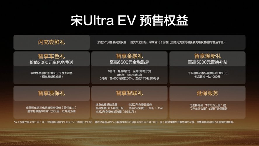 2026年3月5日,比亚迪王朝B级闪充SUV 宋Ultra EV正式开启预售,全系搭载比亚迪第二代刀片电池及闪充技术,同时配备多项奢适配置。新车预售价15.5-18.5万元。同时,预订用户还将享受整整18个月免费闪充权益。