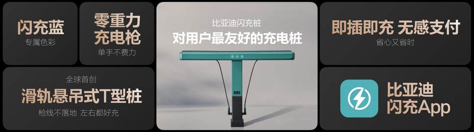 传统公共充电桩枪重、线脏、移动不灵活,充电流程还很繁琐,为了解决这些痛点,比亚迪闪充桩采用了全球首创的“滑轨悬吊式T型桩”设计,让线拉着枪,手感非常轻巧,几乎是“零重力充电枪”;并且,枪线永远保持悬空,避免缠绕更干净;还可以让用户轻松左右滑动,充电更灵活。同时,比亚迪还打通了车和桩之间的所有链路,只需通过比亚迪闪充APP简单设置,即可实现“即插即充,无感支付”,这就是对用户最友好的充电桩。