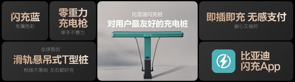 传统公共充电桩枪重、线脏、移动不灵活,充电流程还很繁琐,为了解决这些痛点,比亚迪闪充桩采用了全球首创的“滑轨悬吊式T型桩”设计,让线拉着枪,手感非常轻巧,几乎是“零重力充电枪”;并且,枪线永远保持悬空,避免缠绕更干净;还可以让用户轻松左右滑动,充电更灵活。同时,比亚迪还打通了车和桩之间的所有链路,只需通过比亚迪闪充APP简单设置,即可实现“即插即充,无感支付”,这就是对用户最友好的充电桩。