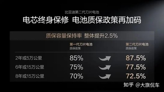 第二代刀片电池通过打造“锂离子高速通道”和“全温域智能热管理系统”,实现了更低的产热和更高效、均匀的散热,让闪充对电池寿命几乎没有影响。基于这样的底气,比亚迪还宣布电池质保政策再加码!第二代刀片电池质保的“容量保持率”整体提升2.5%,电芯依旧是“终身保修”,这就是第二代刀片电池,给所有用户的安心承诺。