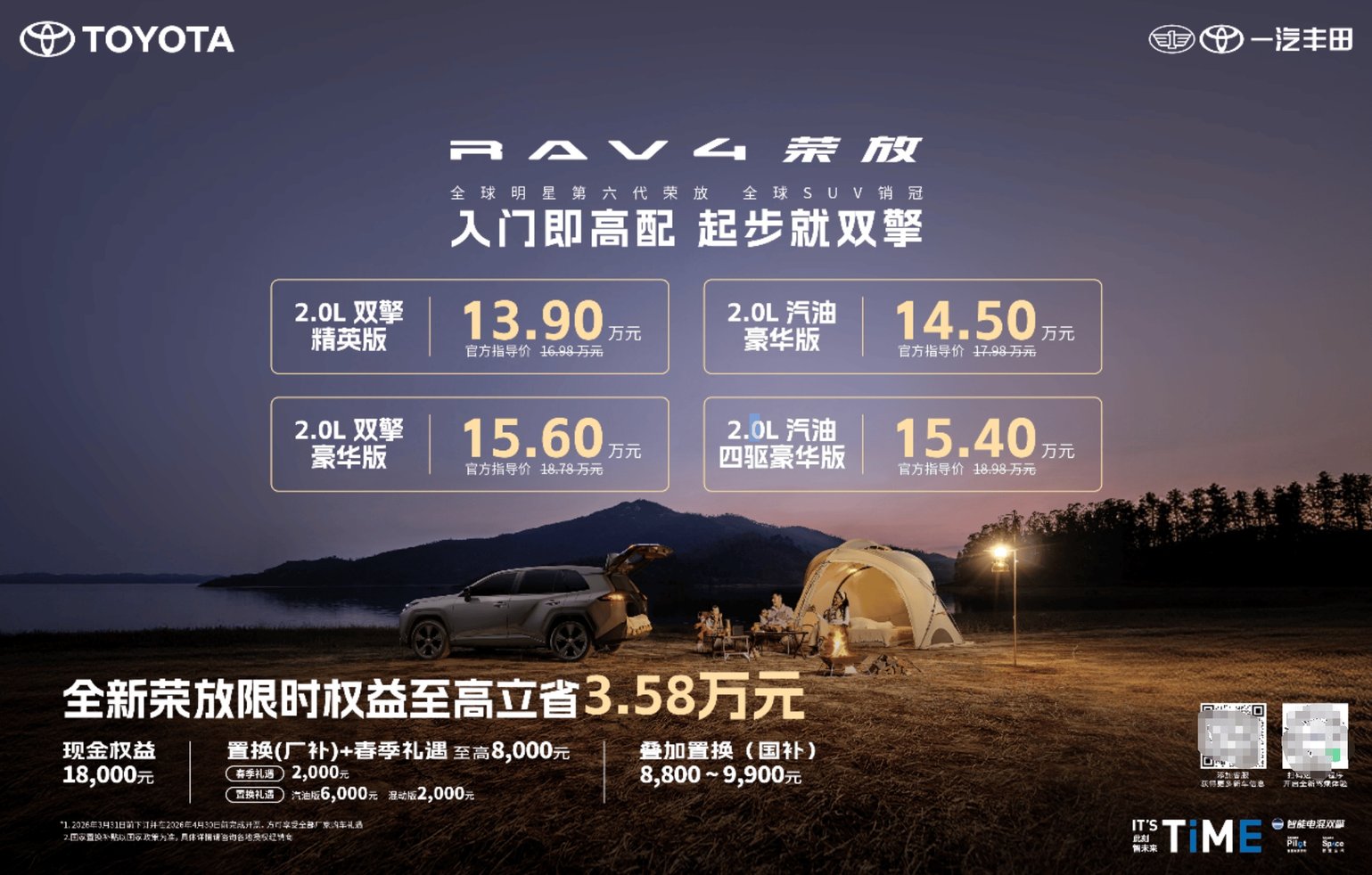 惊喜不止于价格,还有重重福利。2026年3月31日前下订荣放全系并在4月30日前开具发票的用户,即可享受一汽丰田提供的包括春季礼遇和置换补贴在内的至高8000元春日礼。这还不够,用户还可同步享受至高约万元的国家补贴。