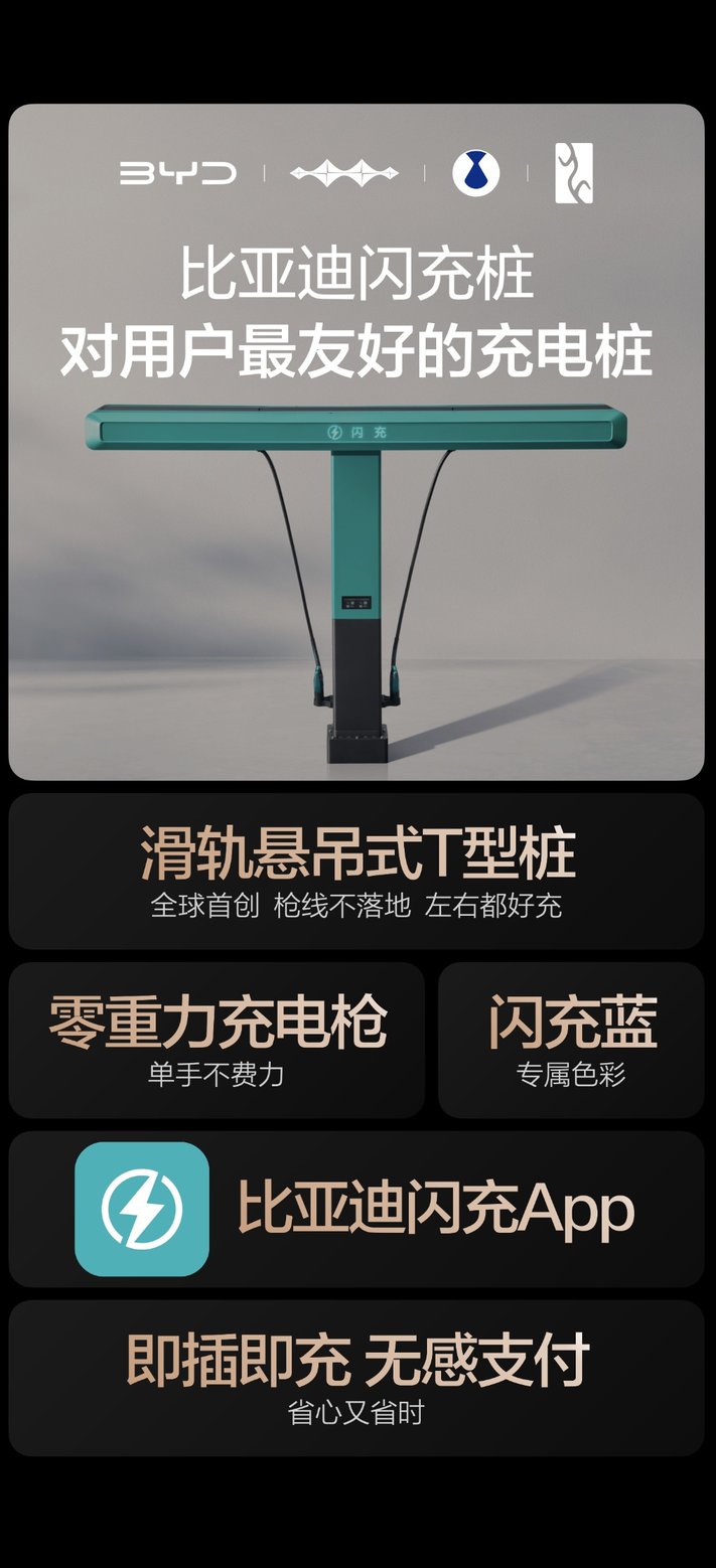 值得一提的是,比亚迪闪充桩采用了全球首创的“滑轨悬吊式T型桩”设计,让线拉着枪,充电枪取放轻如“零重力充电枪”,线缆永不拖地,告别脏污;而且不管你的车充电口在左边还是右边,滑轨设计都能轻松移动。解决了传统公共充电桩枪重、线脏、移动不灵活,充电流程还繁琐的痛点。