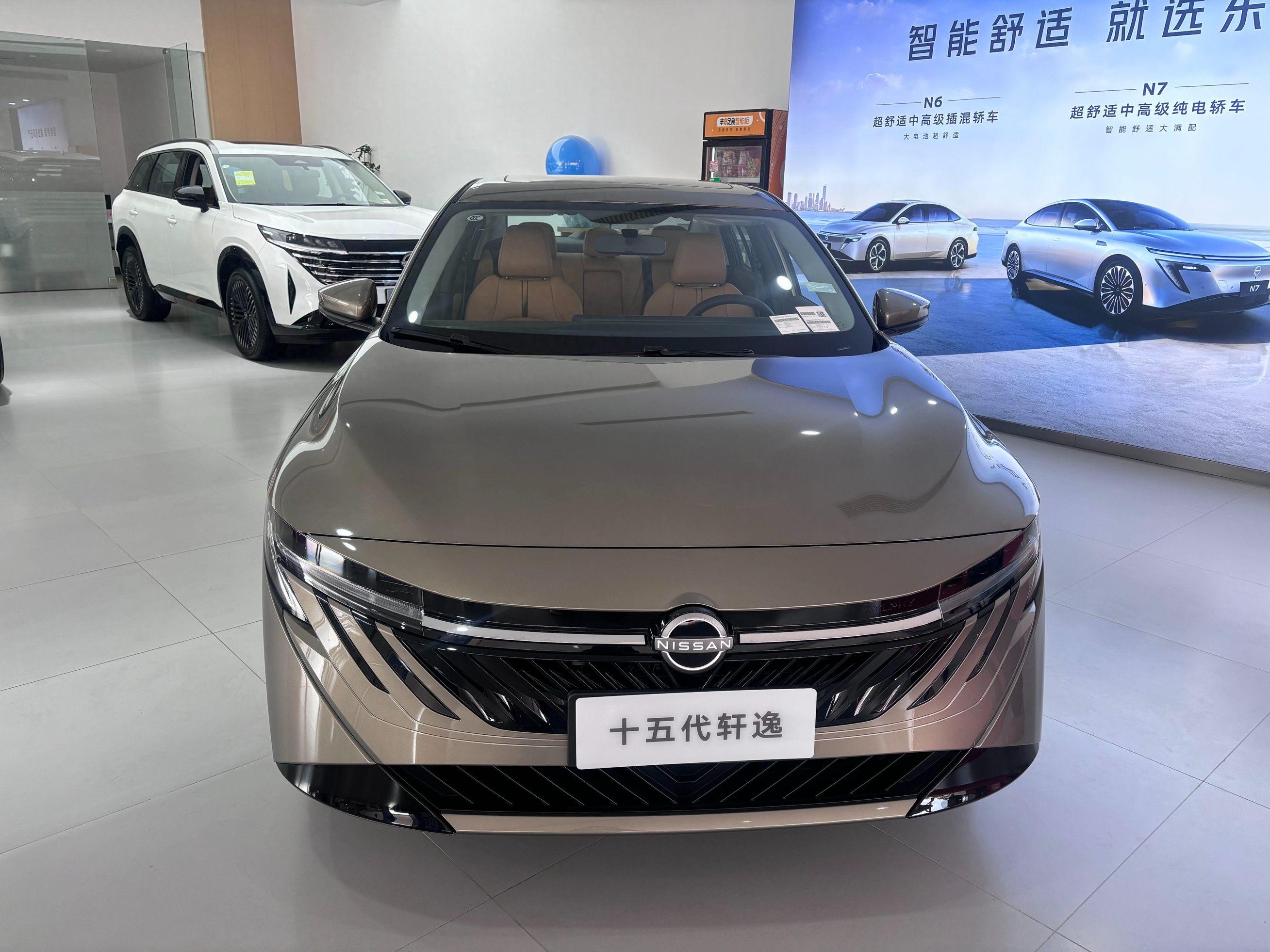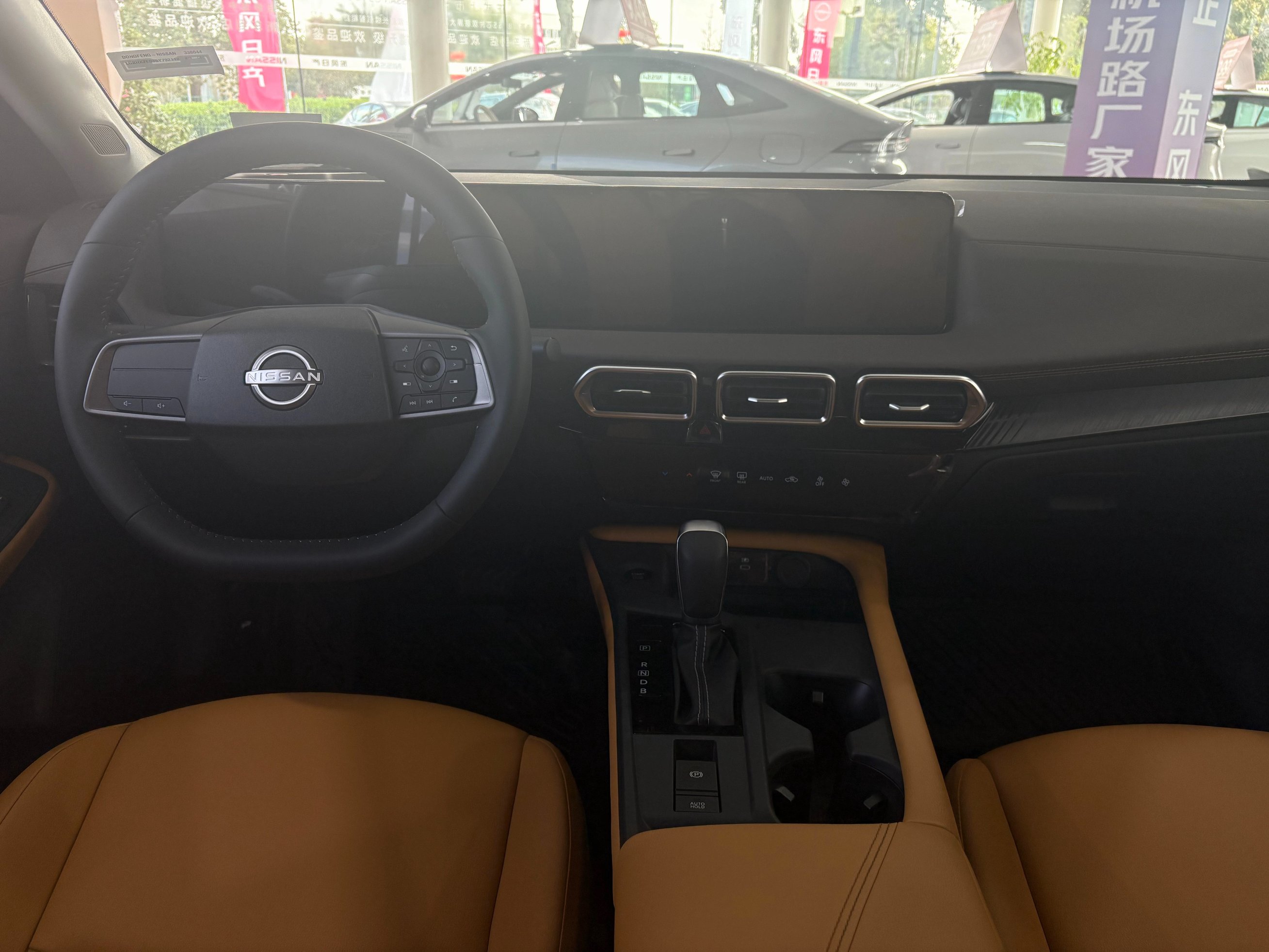 店内摆放的第十五代轩逸是一辆金色外观、棕色内饰的舒享科技版,限时优惠价9.99万。由于新车刚到店且是工作日,探店期间只有两个年轻男性前来看车。