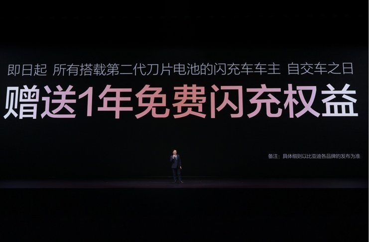 发布会现场,王传福还宣布:所有搭载第二代刀片电池的闪充车车主,均享有重磅“闪充权益”,自交车之日起,在全国闪充站可享受1年的免费闪充权益,让闪充体验更畅快。并且,在闪充免费期结束后,也会同行业保持一致,不会额外收费。