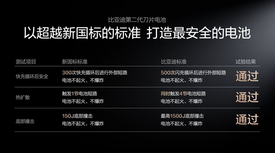 第二代刀片电池继续将安全进行到底,通过一系列超越新国标的安全测试,为用户打造最安全的电池,确保电池全生命周期都安全,彻底打消用户的安全顾虑。