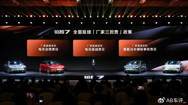 不止于权益,铂智7还有两大承诺,为用户全程兜底:三电系统终身质保,彻底打消用户使用电车的长期焦虑;厂家三担责,即电车自燃、智能泊车事故、电池衰减,均由厂家担责。
