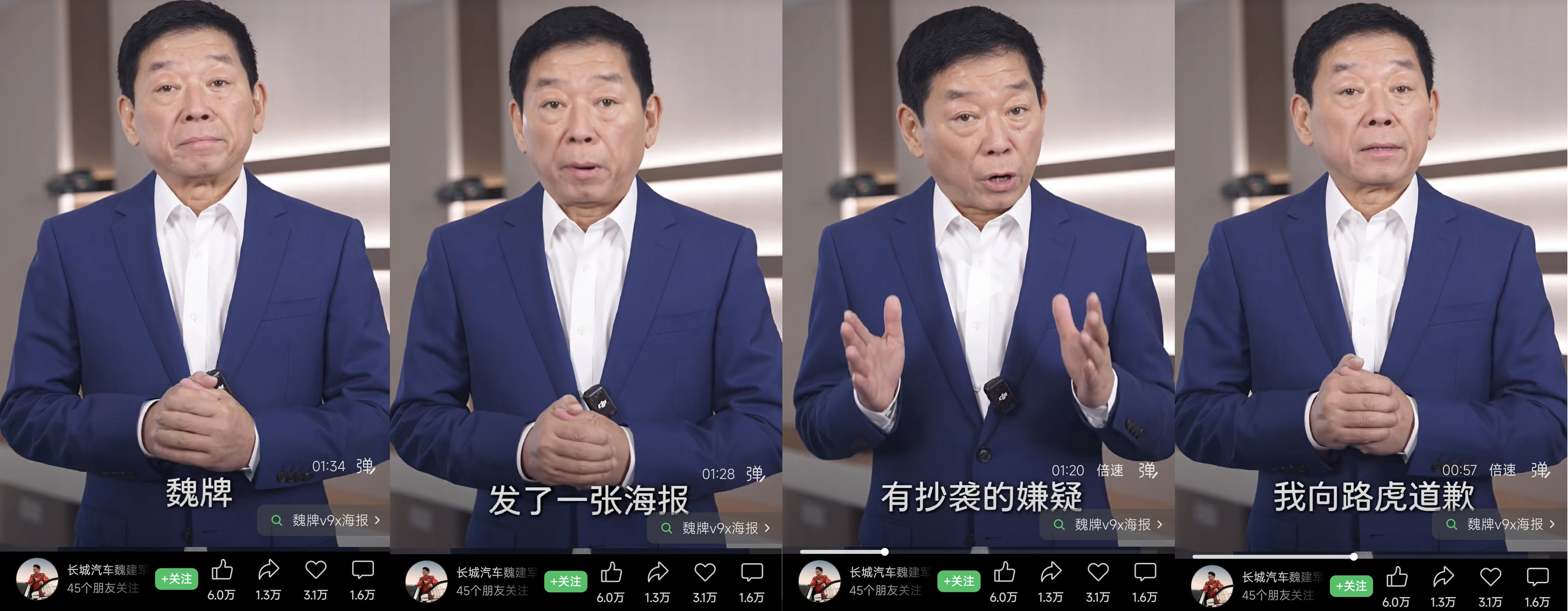 3月5日,魏牌全新车型V9X的官宣海报一经发布,便陷入“1:1复刻路虎揽胜运动版创意”的舆论漩涡。从画面构图、人物侧身站位、低机位视角到光影色调,两张海报的重合度之高,被原创设计师直指“毫无原创性可言”。事件发酵不到24小时,魏牌董事长魏建军便亲自出镜发布道歉视频,一句“那张海报的确是抄袭的,不能有任何辩解”,没有甩锅外包团队,没有模糊其词的推诿,全程直面问题、承担全责,被网友称作近年来品牌危机公关的“教科书式坦诚”。