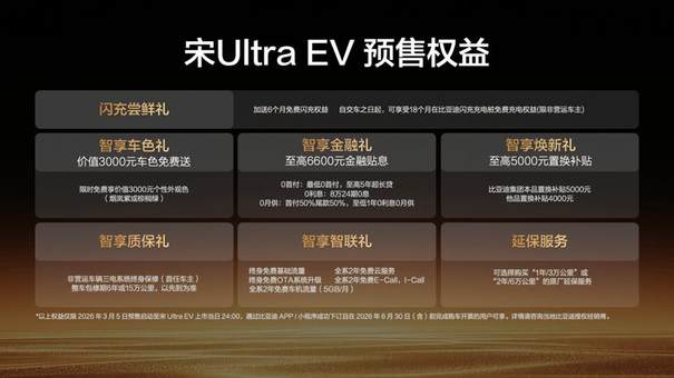 【车媒体丨新车】2026年3月5日,比亚迪王朝B级闪充SUV 宋Ultra EV正式开启预售,全系搭载比亚迪第二代刀片电池及闪充技术,同时配备多项奢适配置。新车预售价15.5-18.5万元。同时,预订用户还将享受整整18个月免费闪充权益。