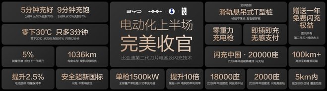 2026年3月5日,比亚迪在深圳大运中心体育馆召开“闪充中国 改变世界”发布会。正式发布:第二代刀片电池及闪充技术,创造全球量产最快充电速度新纪录,从10%到70%,只用5分钟就能充好;从10%到97%,只用9分钟就能充饱;零下30度,从20%到97%,只比常温多3分钟。一举攻克了电动化上半场“充电慢”和“低温充电难”的世界性难题,电动化上半场至此完美收官。同时,发布“闪充中国”战略,年底将在全国建设20000座闪充站,让用户充电更自由、更便捷,从此新能源汽车充电迈入闪充时代,开启闪充新纪元。