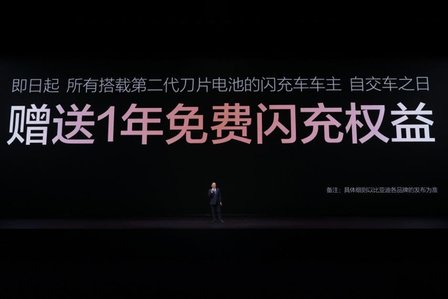 发布会现场,王传福还宣布:所有搭载第二代刀片电池的闪充车车主,均享有重磅“闪充权益”,自交车之日起,在全国闪充站可享受1年的免费闪充权益,让闪充体验更畅快。并且,在闪充免费期结束后,也会同行业保持一致,不会额外收费。