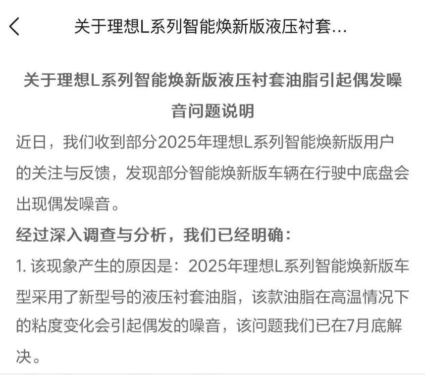 2025年11月,理想汽车官方又针对“2025款L系列部分车辆下摆臂衬套异响批量质量事故”发布了处理公告,表明问题主要是由于L系列25款下摆臂衬套油脂试验验证不充分引起的。