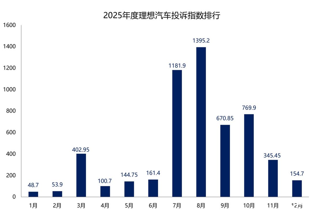 汽车门网数据显示:理想汽车2025年投诉指数达到了5430.4,同比涨幅超5倍,位于年度车企投诉指数榜单的第六名。从月度走势来看,7-10月成为理想汽车全年投诉压力最大且问题最集中的核心爆发期,其中8月投诉指数达到了1395.2,创下全年峰值。