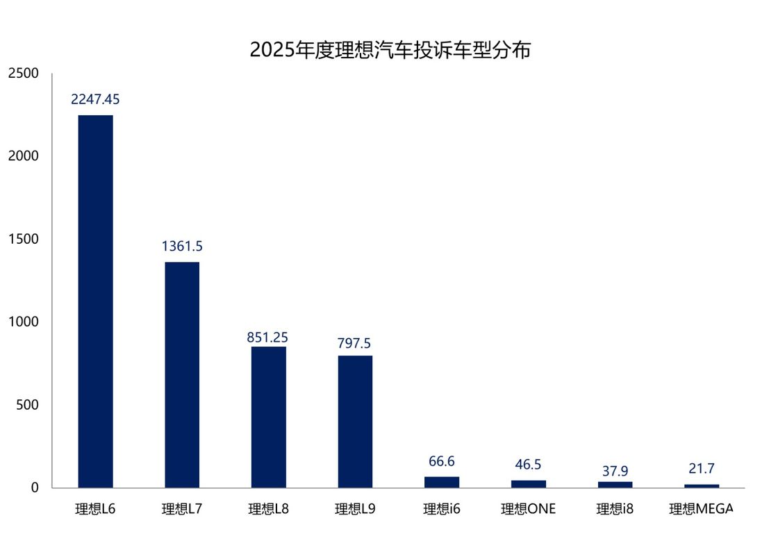 从投诉分布来看,理想汽车的投诉高度集中在理想L系列车型。这其中,理想L6和理想L7成为重点投诉车型,合计投诉占比66%。理想L8和理想L9紧随其后,四款车型合计投诉占理想汽车整体投诉指数的90%。