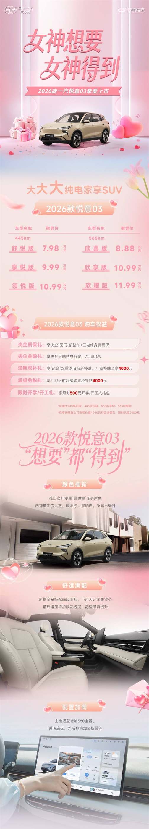 为了让更多家庭轻松拥有这份“悦意”,2026款悦意03还重磅推出央企五重礼遇。购车即享央企质保礼,“无门槛”整车及三电终身质保真诚以待,更有7年真0息央企金融礼,极大降低拥车门槛,同时,新车叠加焕新双补礼,政企双重以旧换新补贴至高4000元,以及限时4000元购置税补贴的超级免税礼、限时500元的开学/开工礼。特别值得一提的是,还有限时半价权益,可升级价值4000元的舒适选装包(具体优惠政策请详询当地经销商)。在这个女神节,让爱与梦想零负担启程。