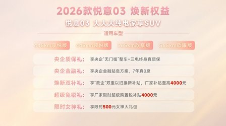 为了让更多家庭轻松拥有这份“悦意”,2026款悦意03还重磅推出央企五重礼遇。购车即享央企质保礼,“无门槛”整车及三电终身质保真诚以待,更有7年真0息央企金融礼,极大降低拥车门槛,同时,新车叠加焕新双补礼,政企双重以旧换新补贴至高4000元,以及限时4000元购置税补贴的超级免税礼、限时500元的开学/开工礼。特别值得一提的是,还有限时半价权益,可升级价值4000元的舒适选装包(具体优惠政策请详询当地经销商)。在这个女神节,让爱与梦想零负担启程。