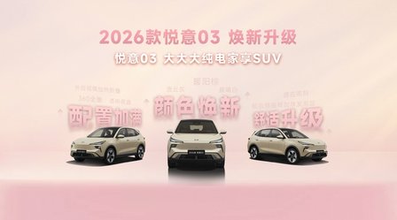 三月春暖,悦见花开。3月8日妇女节,实力演员张若昀直播助阵,“大大大纯电家享SUV”焕新而来,2026款悦意03挚爱上市,为每一位女神献上春天的礼物。445km、565km两种续航共计6款车型,官方售价7.98-11.99万元。围绕年轻小家庭,尤其是家庭女性用户的进阶需求,从颜色推新到舒适满配,2026款悦意03带来全新晨晖金车色、晨曦白内饰色等20余项升级,让用车更舒心、开车更省心、养车更安心,正如张若昀所说:“悦意03是真舒适的纯电SUV。”当前购车还可享7年0息贷款、无门槛整车及三电终身质保等丰富权益,轻松开启高品质纯电生活。