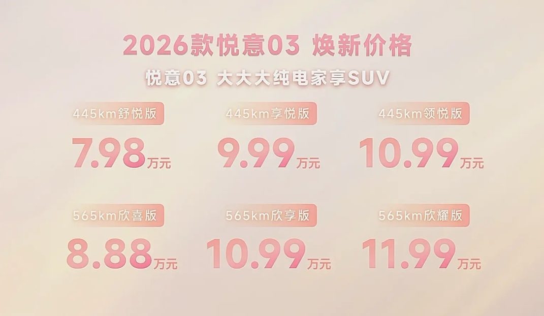 大家好,我是大李。说实话,刚看到2026款奔腾悦意03上市价格的时候,我以为自己看错了。7.98万到11.99万元,这个价位搁在几年前,咱们能买到啥?顶多是个代步的小车。但现在,一汽奔腾直接把一台轴距2750mm的纯电紧凑型SUV砸到了这个区间,这是直接开大招了?