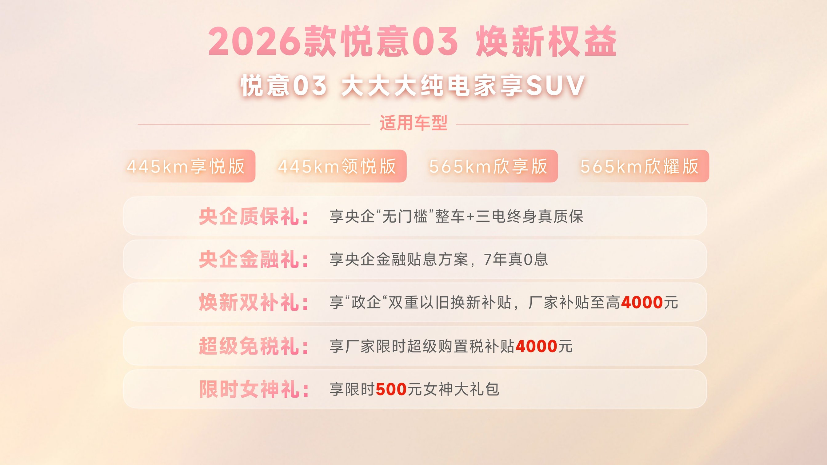 三月春暖,悦见花开。3月8日妇女节,实力演员张若昀亮相直播间,为“大大大纯电家享SUV”的焕新助阵——2026款悦意03正式“挚爱”上市,为每一位女神送上春天的礼物。新车推出445km、565km两种续航共6款车型,官方售价7.98万-11.99万元,以“加配不加价”的诚意精准锁定年轻家庭尤其是女性用户的心 。