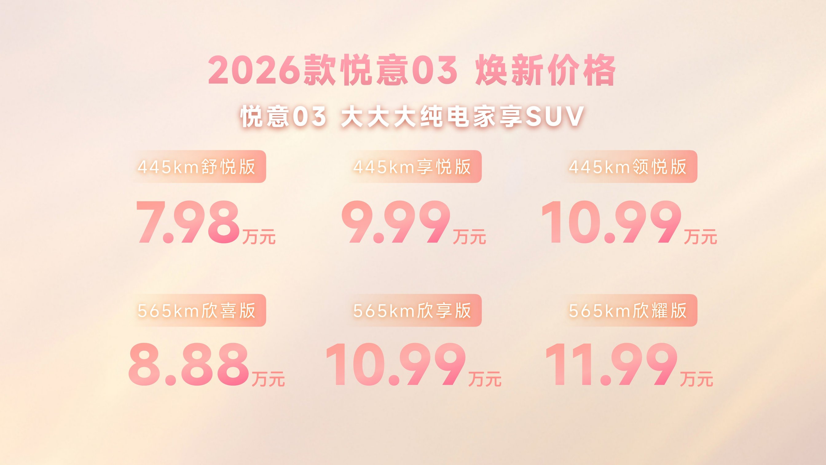 在7.98万-11.99万元这个价格区间,纯电SUV的竞争早已红海一片。但2026款悦意03的上市,让我们看到了车企在消费者画像上的一次精准聚焦。