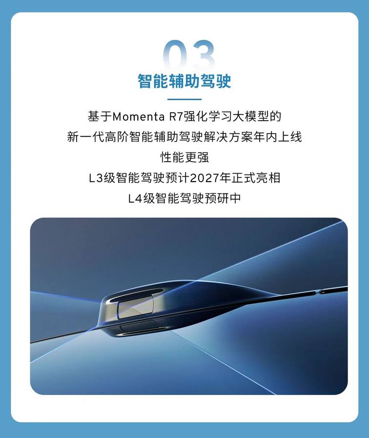通过和Momenta的深度合作,搭载R7强化学习大模型的新一代高阶智能辅助驾驶解决方案将于年内上线,L3级智能驾驶预计2027年正式亮相,L4级智能驾驶也在预研中。