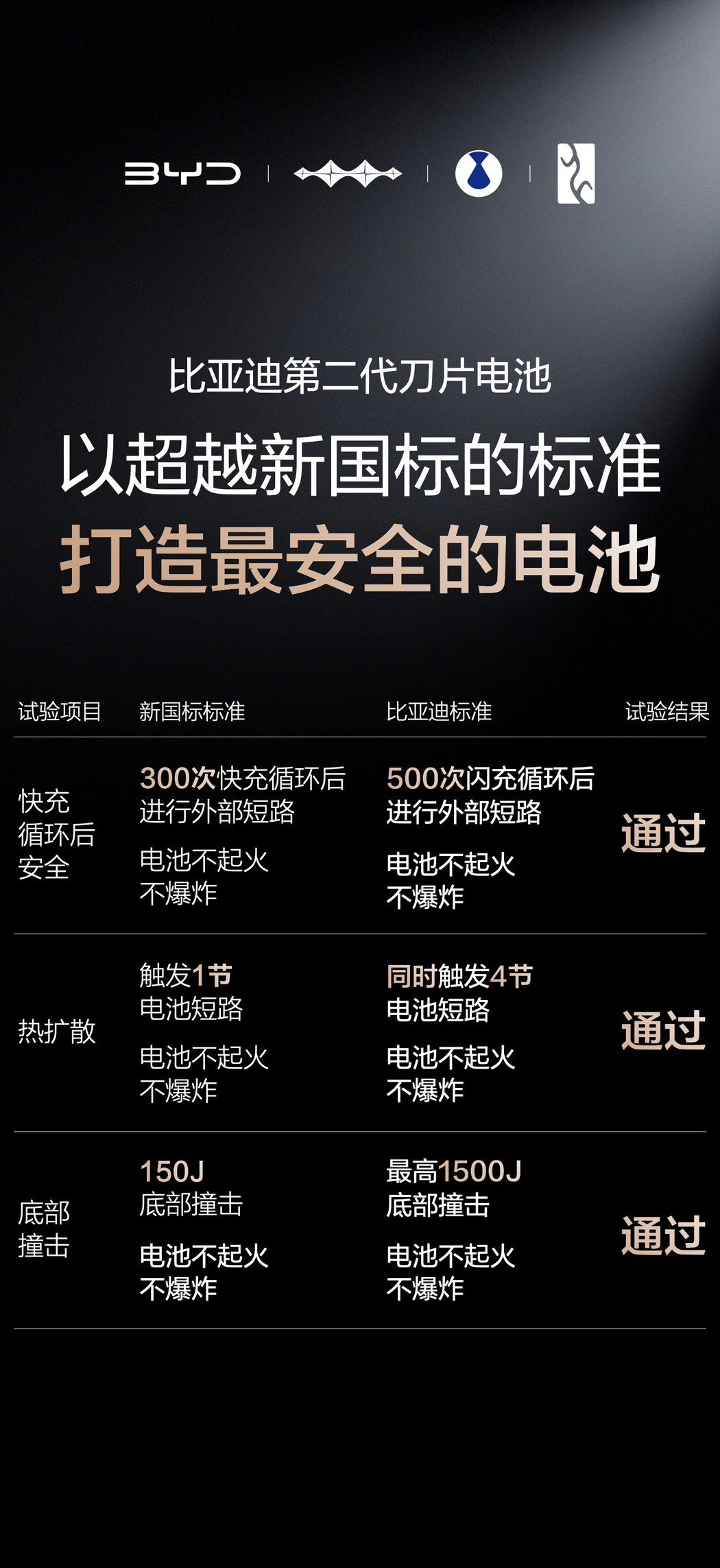 事实上,得益于科技创新,比亚迪闪充带来的产热低且散热佳,对电池寿命的影响微乎其微。既充得快,又很耐用,更安全!第二代刀片电池通过了一系列远超新国标的严苛安全试验,确保电池全生命周期的安全稳定,彻底打消用户的安全顾虑。