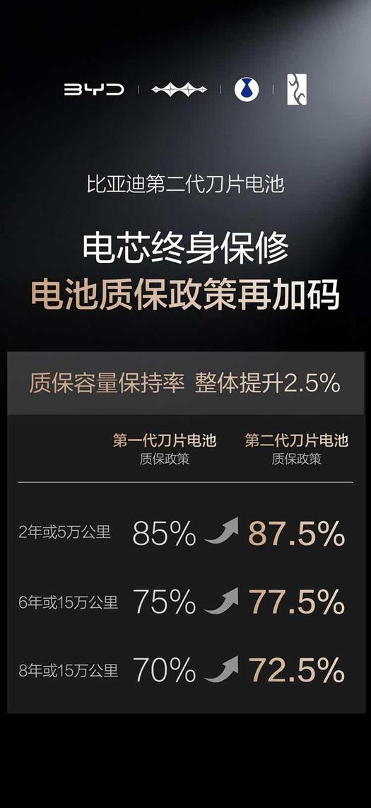 一直以来,大功率闪充的产热问题,都是制约充电速度与电池寿命平衡的关键。比亚迪深谙电池技术核心,凭借 “锂离子高速通道” 和 “全温域智能热管理系统” 两大技术突破,让闪充过程少产热、快散热,从根源上解决了闪充对电池寿命的影响。这份技术底气,更体现在加码的质保政策中 —— 第二代刀片电池容量保持率整体提升2.5%,低于77.5%即可免费包换,电芯依旧终身保修,用实打实的承诺打消用户顾虑。
