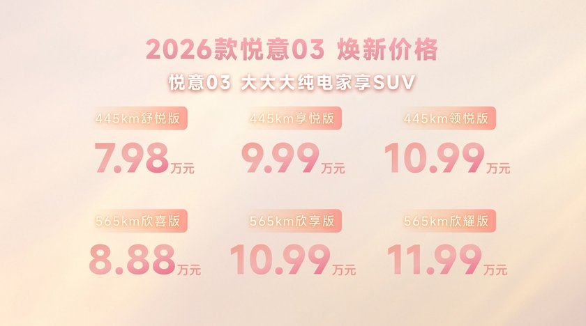 7.98万起售+20余项升级 2026款悦意03精准卡位家庭纯电SUV市场