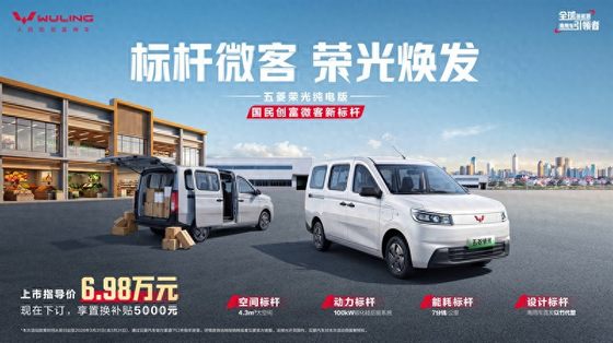 “标杆微客,荣光焕发”。2026年3月9日,五菱荣光纯电版正式上市,推出310km标准型,售价6.98万元。作为“国民创富微客新标杆”,新车拥有4.3㎡大空间,还搭载行业领先的100kW高效碳化硅后驱系统、国际领先的“以竹代塑”环保内饰等创新技术,实现“空间、动力、能耗、设计”四大维度的全面标杆进化,引领以燃油为主的微客市场进入新能源时代。即日起,全国用户通过五菱汽车官方渠道下订五菱荣光纯电版,即可享受5000元的置换补贴,助力奋斗者创富再加码,让新能源发展红利惠及更多以微客为主要创富工具的小微创业者。