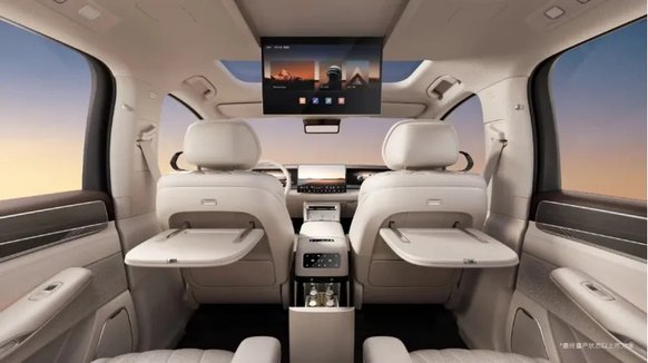 内饰延续唐L设计理念,但豪华感大幅提升。配备全液晶仪表、悬浮式中控、副驾娱乐屏组成的三屏系统,还有HUD抬头显示。方向盘更粗壮,车门改用电子按键开启。座椅采用2+2+2的6座布局,第二排为独立座椅,带一体式腿托、菱形缝线,支持一键躺平。二排还提供大尺寸折叠屏、小桌板和车载冰箱,第三排座椅也可电动调节并带加热功能。