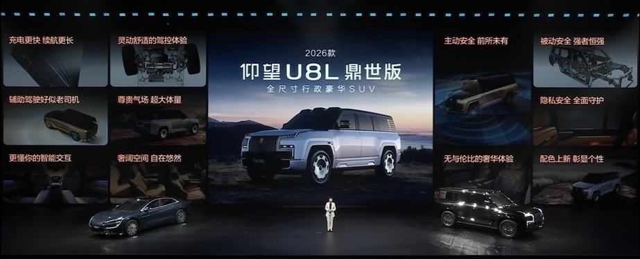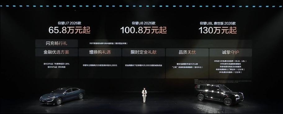 2026款仰望U7、U8、U8L的推出,闪充技术赋能极致体验,并根据自己的市场定位和产品特性,强化了它们各自的“专业能力”:U7更具驾驶乐趣而且可以畅跑、U8有更强的全地形能力,能带你去更远的地方、U8L的鼎级安全再度升级。