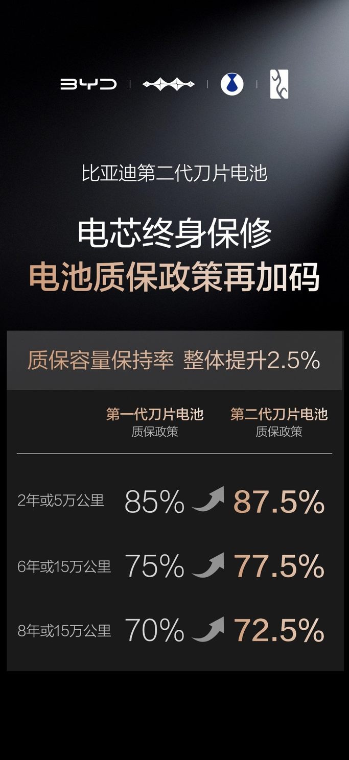不过,技术原理是一回事,实际保障是另一回事。真正值得关注的是质保政策的变化:第二代刀片电池的质保“容量保持率”整体提升2.5%,低于77.5%就免费包换,电芯依旧是终身保修。这个数字比第一代更严苛,意味着官方愿意为电池寿命“兜底”——如果闪充真的大幅影响寿命,承保存款的是车企自己。