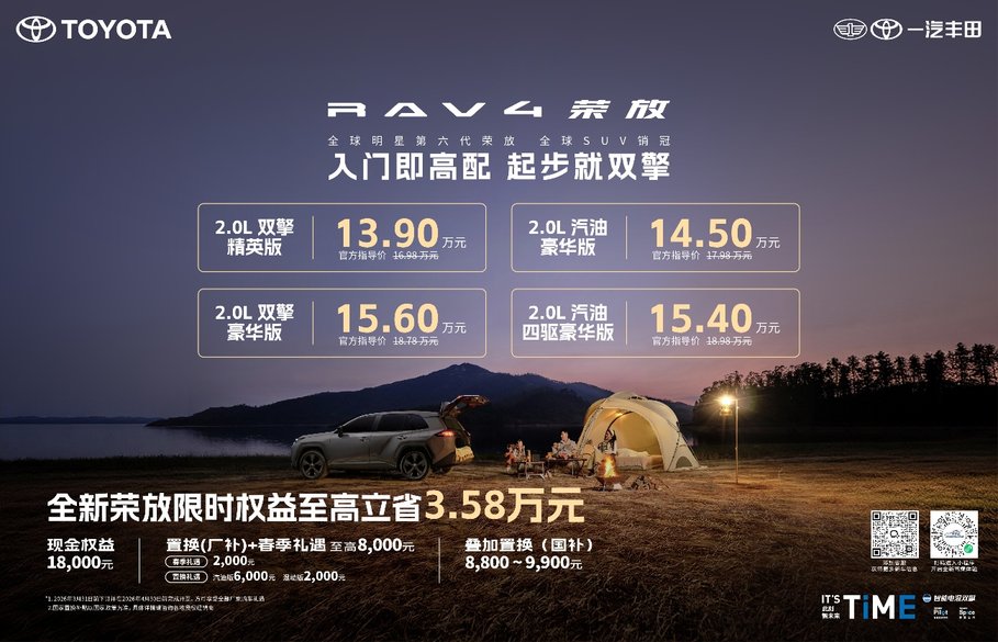 惊喜不止于价格,还有重重福利。2026年3月31日前下订荣放全系并在4月30日前开具发票的用户,即可享受一汽丰田提供的包括春季礼遇和置换补贴在内的至高8000元春日礼。这还不够,用户还可同步享受至高约万元的国家补贴。