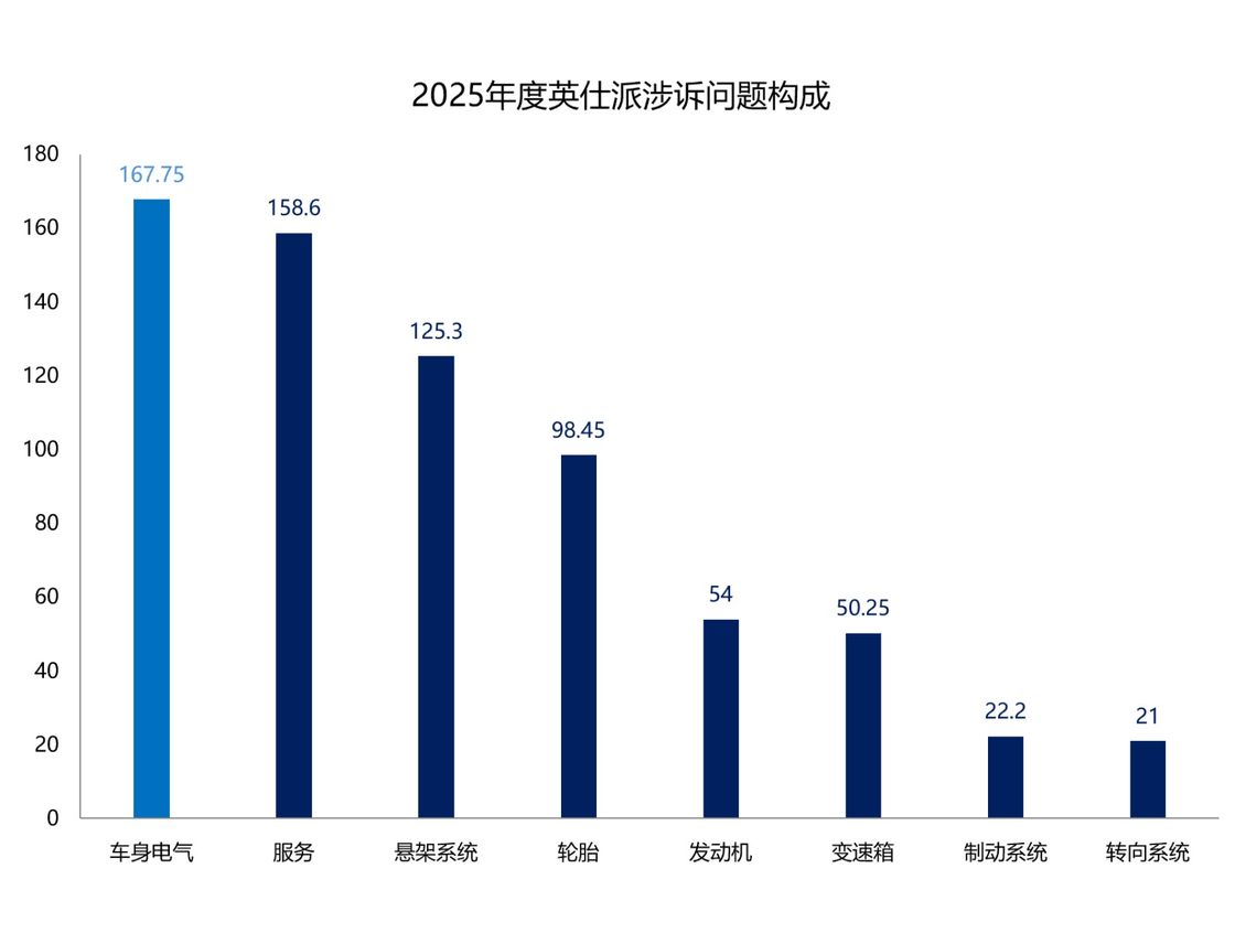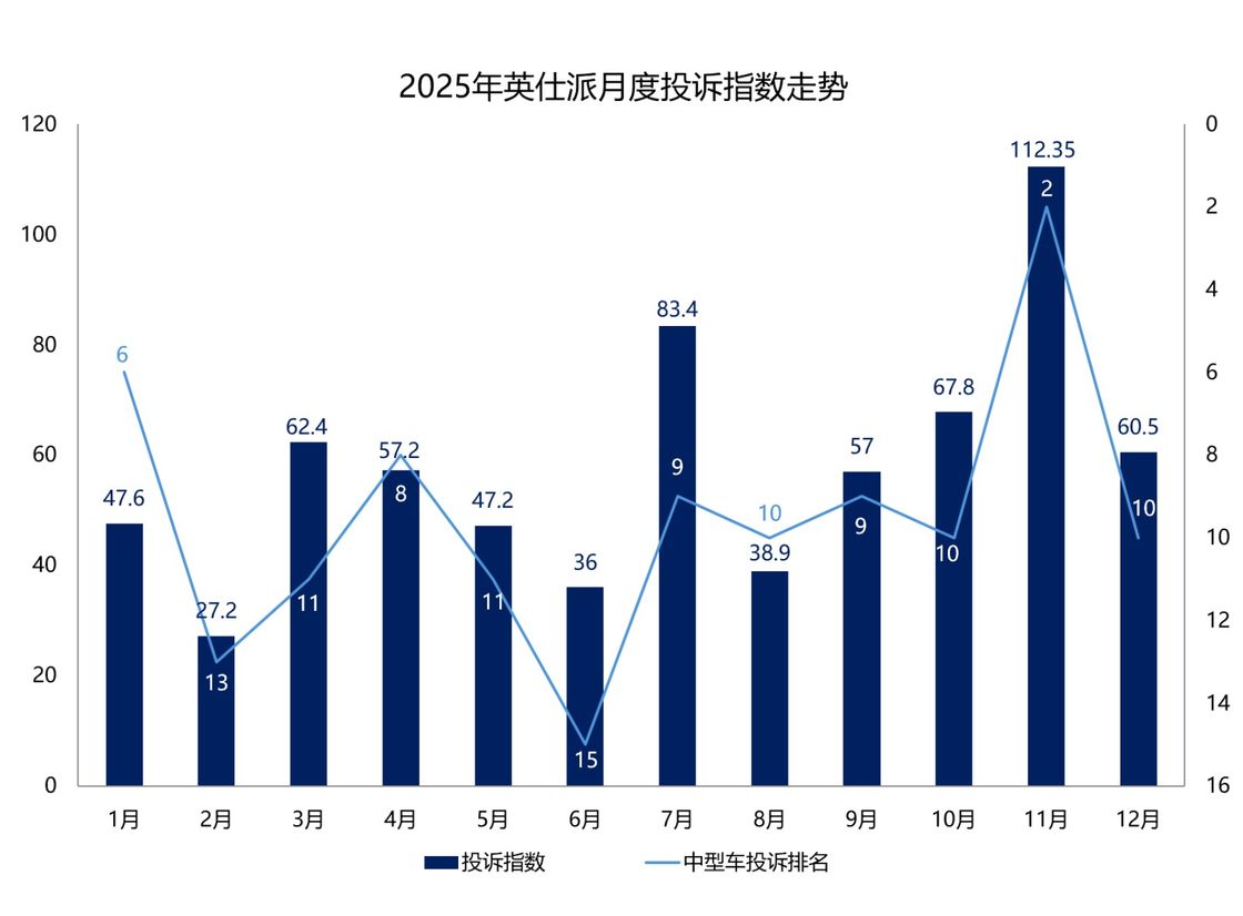 汽车门网数据显示:2025年英仕派的投诉指数达到了697.55,同比上涨了30%,在年度中型车投诉榜单中位列第十一名。从月度走势分析,英仕派的全年投诉指数整体表现相对平稳,多数月份维持在70以下,不过7月和11月其投诉指数明显走高,或遭遇集中投诉。在月度行业排名中,英仕派长期处于中型车投诉榜单前十五名。