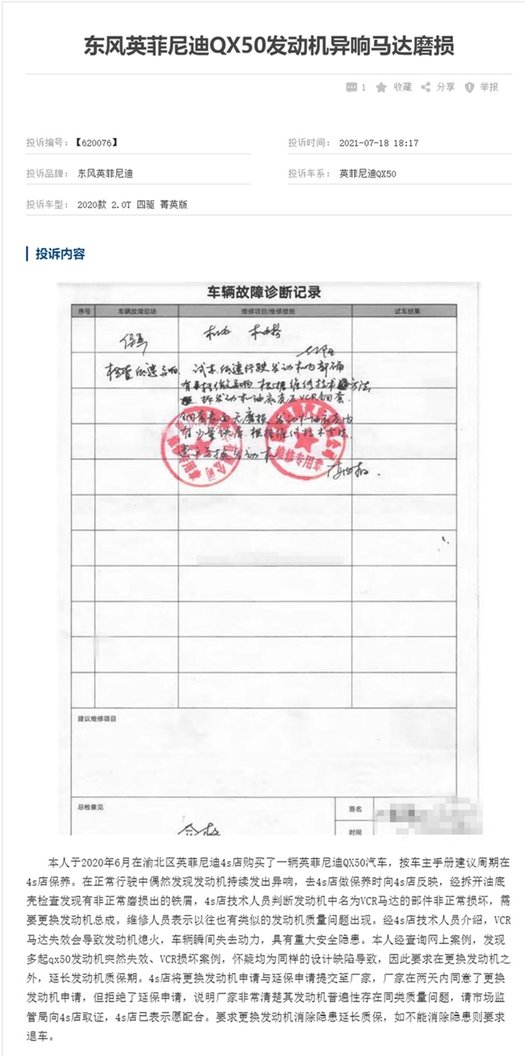 虽说官方否认国内存在同款缺陷,但从某汽车质量投诉平台的数据来看,国内QX50的发动机相关投诉也确实存在。有车主反馈,车辆出现发动机怠速异响、加速时异响明显、故障灯反复亮起、VCR可变压缩比模块频繁失效等问题,还有车主在质保期内就遇到发动机严重磨损,4S店直接要求更换发动机总成,这些故障征兆,和北美问题发动机的早期表现高度吻合,并非个例,也让官方的“无缺陷”说法,很难让国内车主真正信服。