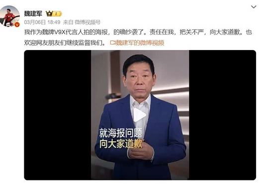 事情起因是魏牌V9X官宣他成为代言人时发布的一张海报,被网友指出与路虎揽胜运动版的创意高度相似。面对对比图,魏建军没有公关辞令,没有调查结论,只有一句话:“经过核查,那张海报的确是抄袭的,不能有任何的辩解,在这里我向路虎道歉,向原版海报的设计师道歉,也向信任我的网友朋友们道歉。”