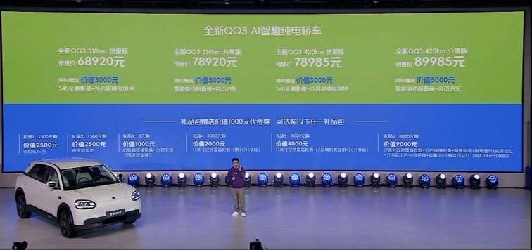 3月10日,奇瑞全新QQ3正式开启预售,新车共推出310km、420km两种续航版本共四款车型,预售价68920元至89985元。秉持“高配不高价”的定价初心,全新QQ3将后置后驱、独立悬架、欧式植绒玻璃导槽等数十项越级配置纳入全系标配,真正实现“全系高配不将就”,精准契合年轻人“理性消费、追求极致性价比”的核心诉求。发布会同步推出多重购车福利:下定1000元可抵2000元,限时赠送全景影像、外后视镜加热等实用配置,进一步降低年轻体的购车门槛。这份诚意打破了常规“高品质必高价格”的固有认知,尽显国民小车的责任与担当。