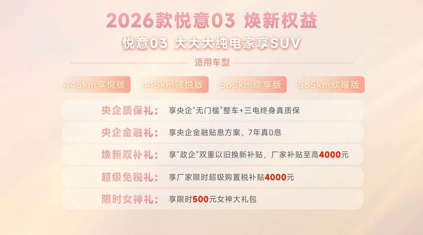 三月春暖,悦见花开。3月8日妇女节,实力演员张若昀直播助阵,“大大大纯电家享SUV”焕新而来,2026款悦意03挚爱上市,为每一位女神献上春天的礼物。445km、565km两种续航共计6款车型,官方售价7.98-11.99万元。围绕年轻小家庭,尤其是家庭女性用户的进阶需求,从颜色推新到舒适满配,2026款悦意03带来全新晨晖金车色、晨曦白内饰色等20余项升级,让用车更舒心、开车更省心、养车更安心,正如张若昀所说:“悦意03是真舒适的纯电SUV。”当前购车还可享7年0息贷款、无门槛整车及三电终身质保等丰富权益,轻松开启高品质纯电生活。