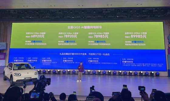 今年2月,停产12年的奇瑞QQ以纯电身份回归,首款车型QQ3开启盲订;3月10日,该车正式开启预售,新车共提供四款配置车型,其中310km热爱半预售价为68920元、310km分享版78920元、410km热爱版78985元、410km分享版89985元。