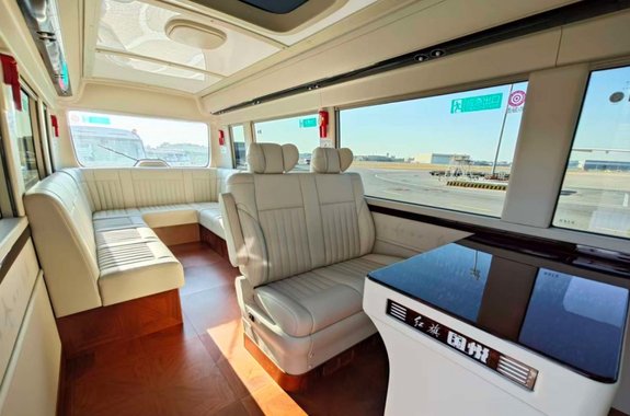 为提供出行途中更好的办公体验,车内更搭载了全新设计的带220V电源的办公桌和折叠助理桌、一键投屏折叠电视、办公位亮度可调阅读灯、冰箱、纳米生态离子织物顶棚等贴心配置。车内饰采用环保材质,禁用物质十项达标率100%,独立循环的过滤PM2.5和空气净化功能,全程呵护乘客出行安全健康。
