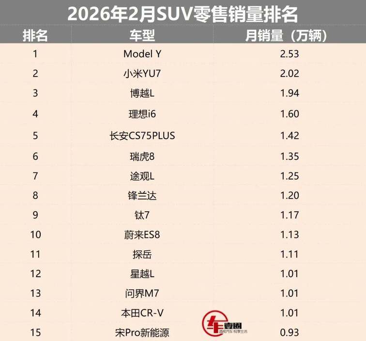 如前所述,由于各位SUV“选手”在2月的表现属实较为低迷,因此能称得上“领跑”的车型也勉强只有三款。其中,特斯拉Model Y当月共售出2.53万辆,较排名次席的小米YU7多出约5100辆——就2月的整体市场数据而言,如此优势似乎可算是“断层领先”了。