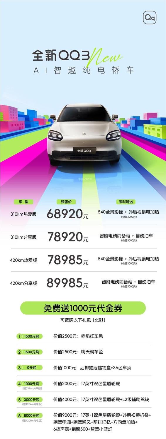 68920元起,奇瑞全新QQ3正式开启预售,新车定位A0级纯电小车
