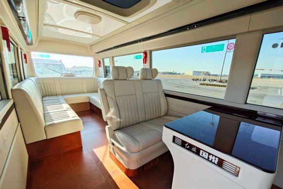 为提供出行途中更好的办公体验,车内更搭载了全新设计的带220V电源的办公桌和折叠助理桌、一键投屏折叠电视、办公位亮度可调阅读灯、冰箱、纳米生态离子织物顶棚等贴心配置。车内饰采用环保材质,禁用物质十项达标率100%,独立循环的过滤PM2.5和空气净化功能,全程呵护乘客出行安全健康。