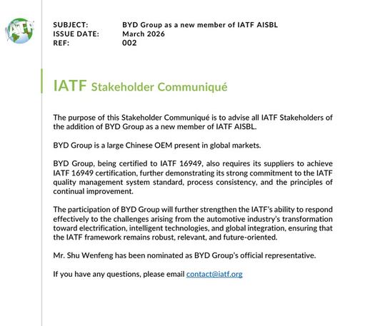 2026年3月比亚迪成为IATF国际汽车工作组的新晋成员,IATF是什么机构?这是一家成立于1999年,旨在协调和统一全球汽车行业的质量管理体系标准的机构。 该组织会按汽车行业的特殊要求,制定并维护着国际通用的IATF 16949汽车质量管理体系标准。 IATF的组织成员包括宝马、福特、通用、大众等知名汽车集团以及美国、德国、法国、意大利、英国的国家汽车工业协会。