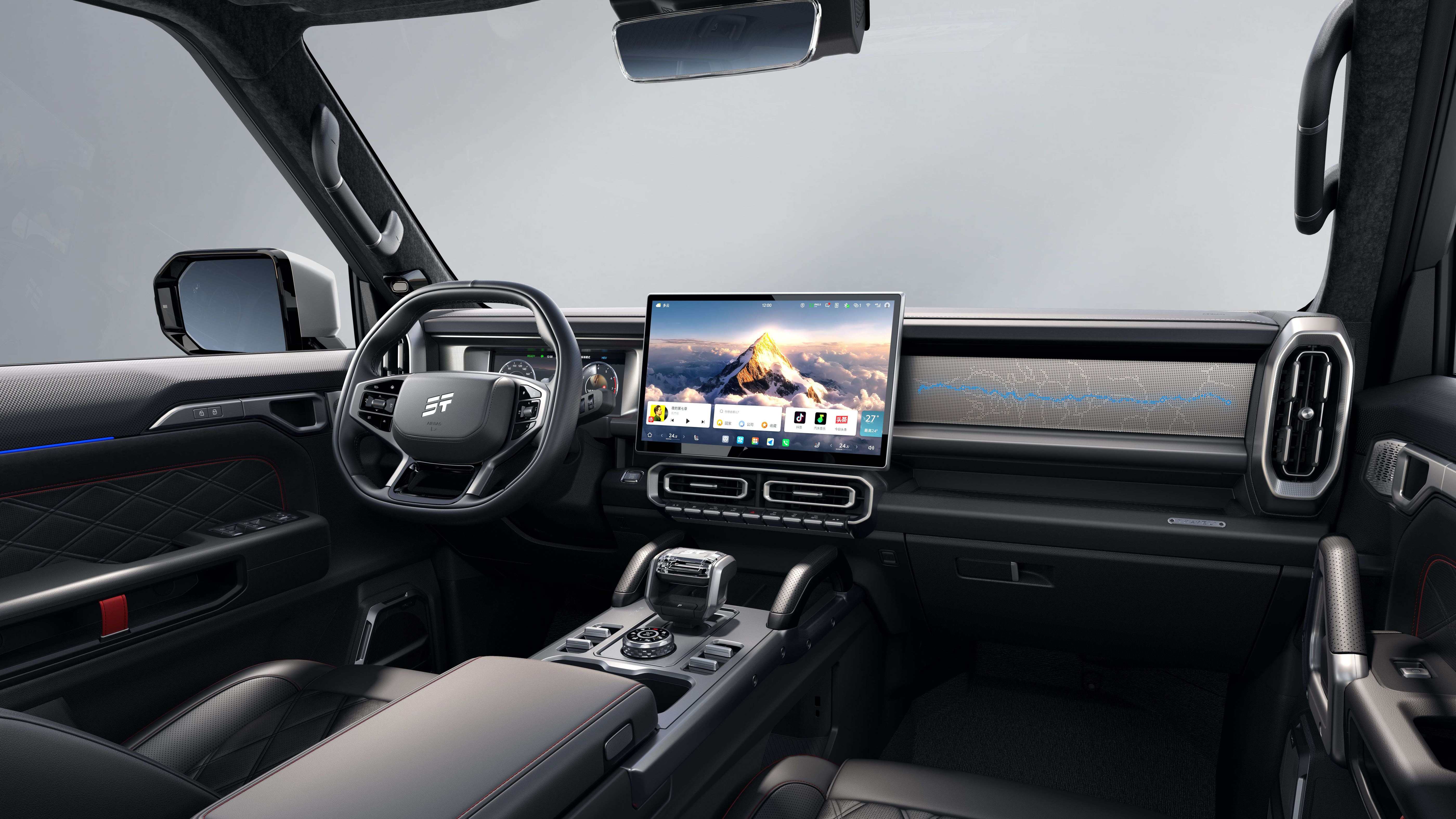 内饰的设计也很有硬派的感觉,中控屏幕的尺寸是15.6英寸,车机系统使用的是TOUR OS 3.0系统,车机芯片用的是高通骁龙8155芯片,车机系统也接入了DeepSeek大模型。