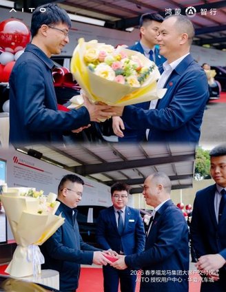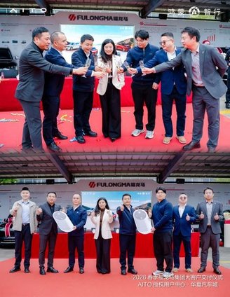 福龙马集团总裁张西铃女士;福龙马智能装备事业部副总经理、销售公司总经理卢宝国先生;福龙马集团智能装备事业部副总经理张启森先生;华为福建终端龙岩区域总经理文锨先生;华为福建终端智选车大客户经理郑庆鑫先生; 华为福建智选车渠道销售经理张佳澎;问界BG福建省区总监王坤武先生;AITO授权用户中心·华夏汽车城总经理王睿先生及各部门相关负责人出席仪式,共同见证车辆交付。