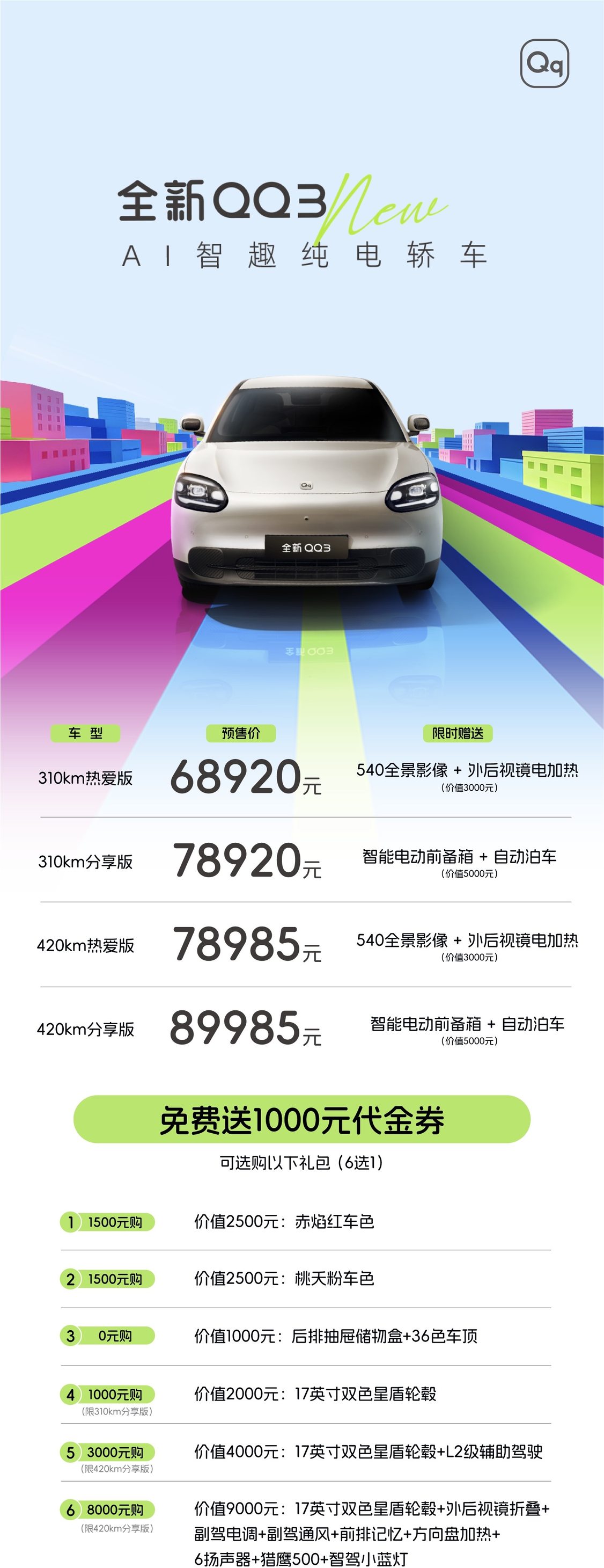 此次预售的全新QQ3共推出310km热爱版、310km分享版、420km热爱版、420km分享版四款车型,预售价格区间为68,920元—89,985元 。新车定位为“AI智趣纯电轿车”,即日起用户下定即可享受包括限时升级配置、现金代金券等多重预售好礼 。