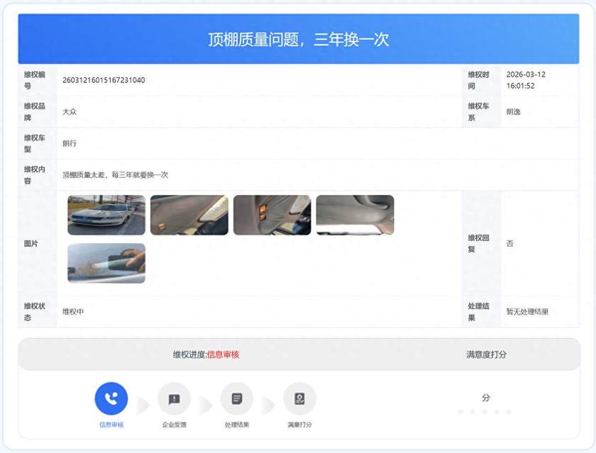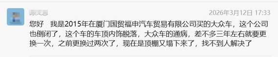 针对车辆车顶内饰反复脱落的质量问题,陈先生提出明确诉求,希望上汽大众方面能够为自己免费更换顶棚,解决车辆长期存在的故障难题。